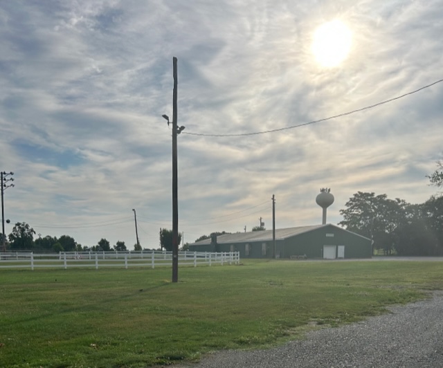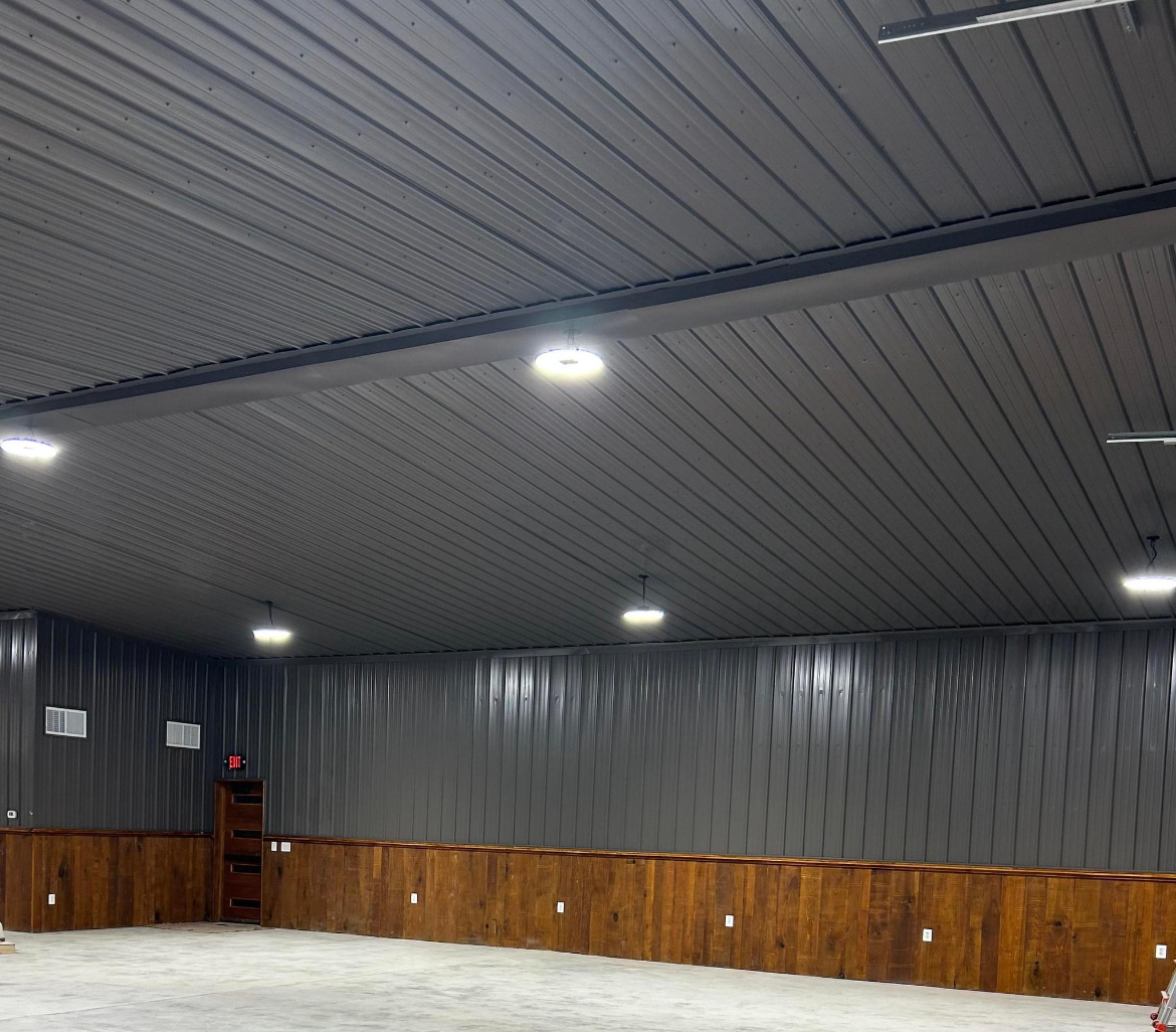 The 3,000 square foot building is heated and air conditioned and includes bathrooms with a baby changing station. The combination charcoal colored metal wainscoting ceiling and walls that meet rough wood panels provides a rustic formal atmosphere. At each end of the center, 16’by20’ garage doors open for ventilation, light, and a view of the rural scenery. Rental possibilities are endless including weddings, rehearsal dinners, engagements, anniversaries, birthday parties, family reunions, baby and bridal showers, work retreats, business parties, funeral receptions, work retreats, or even cornhole tournaments.
