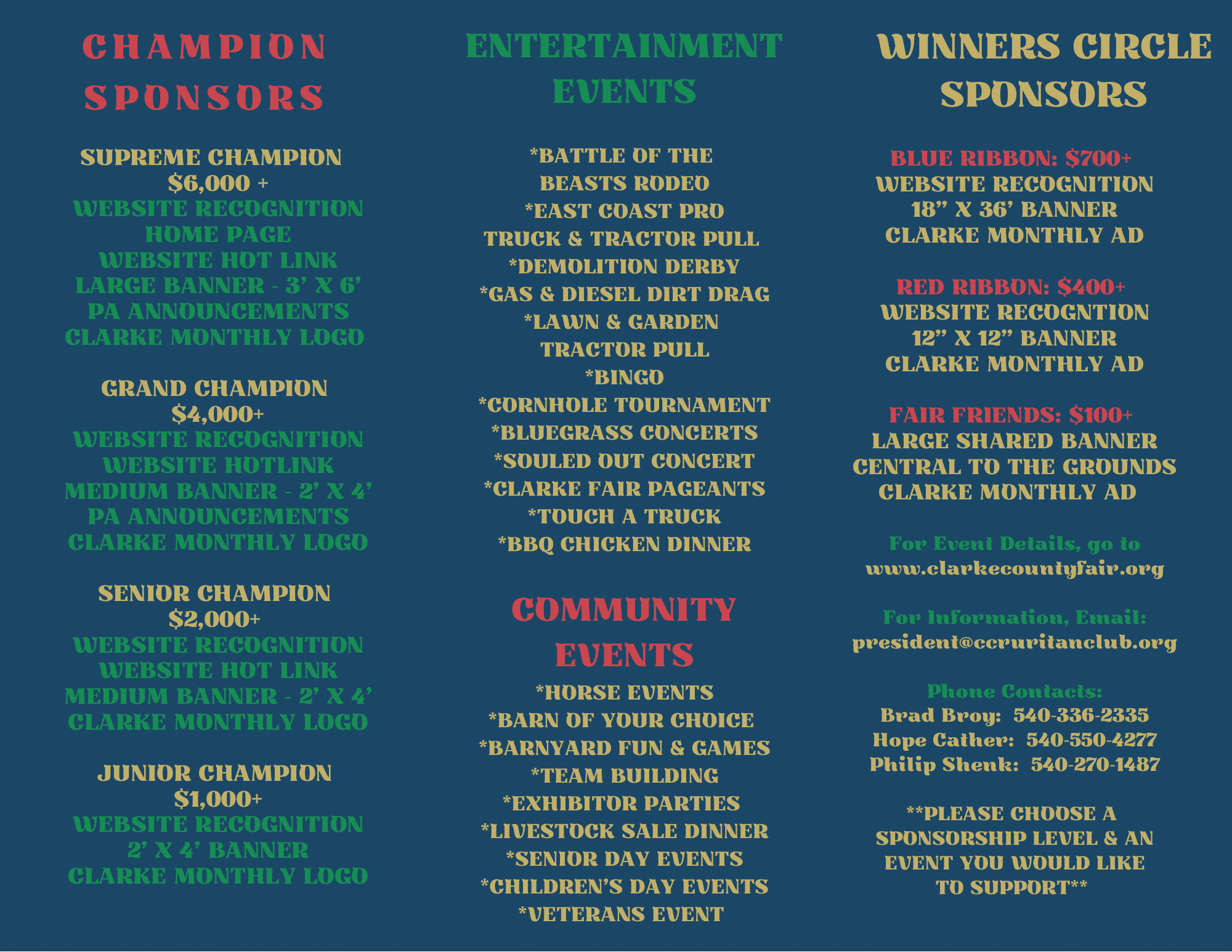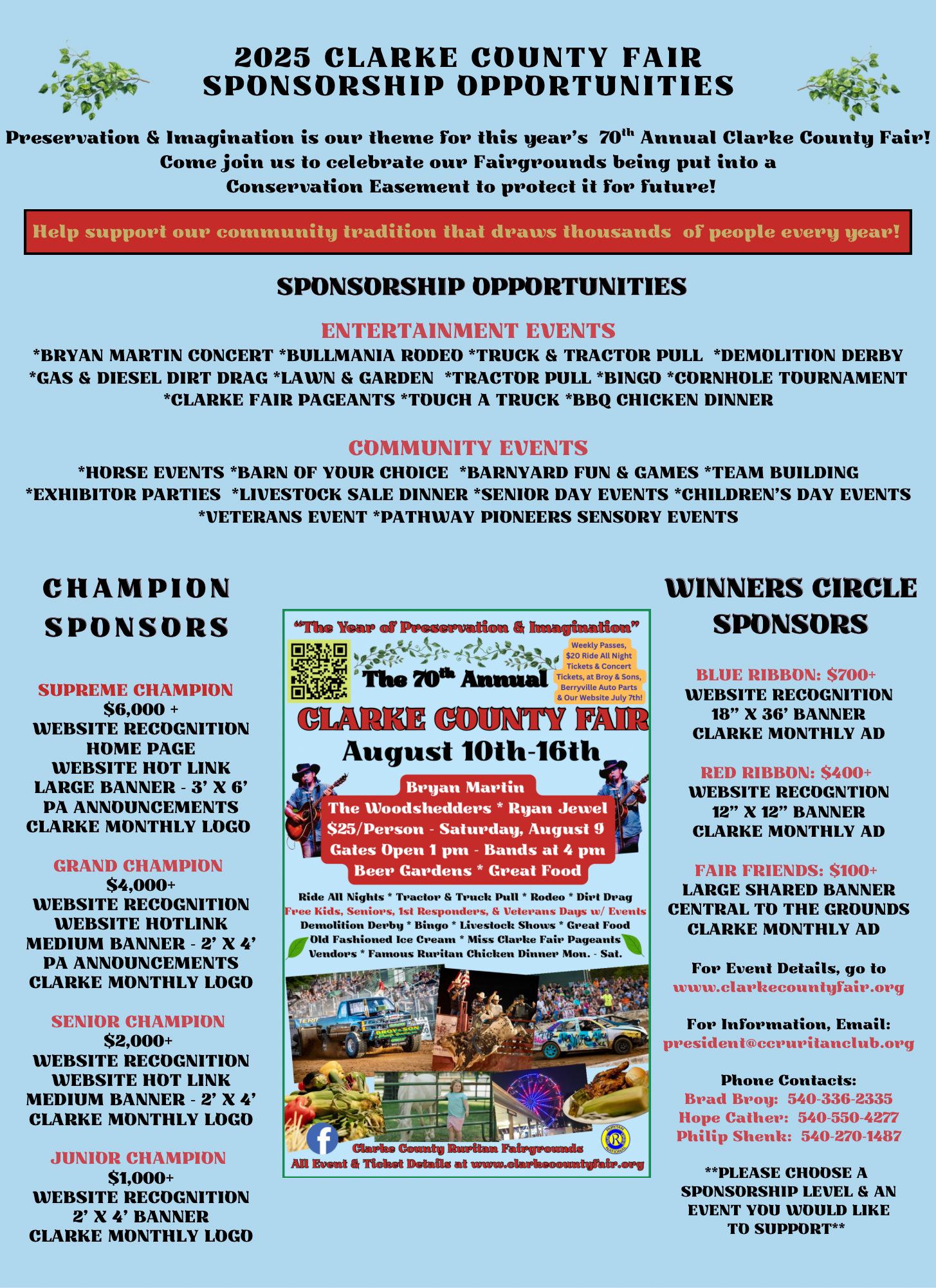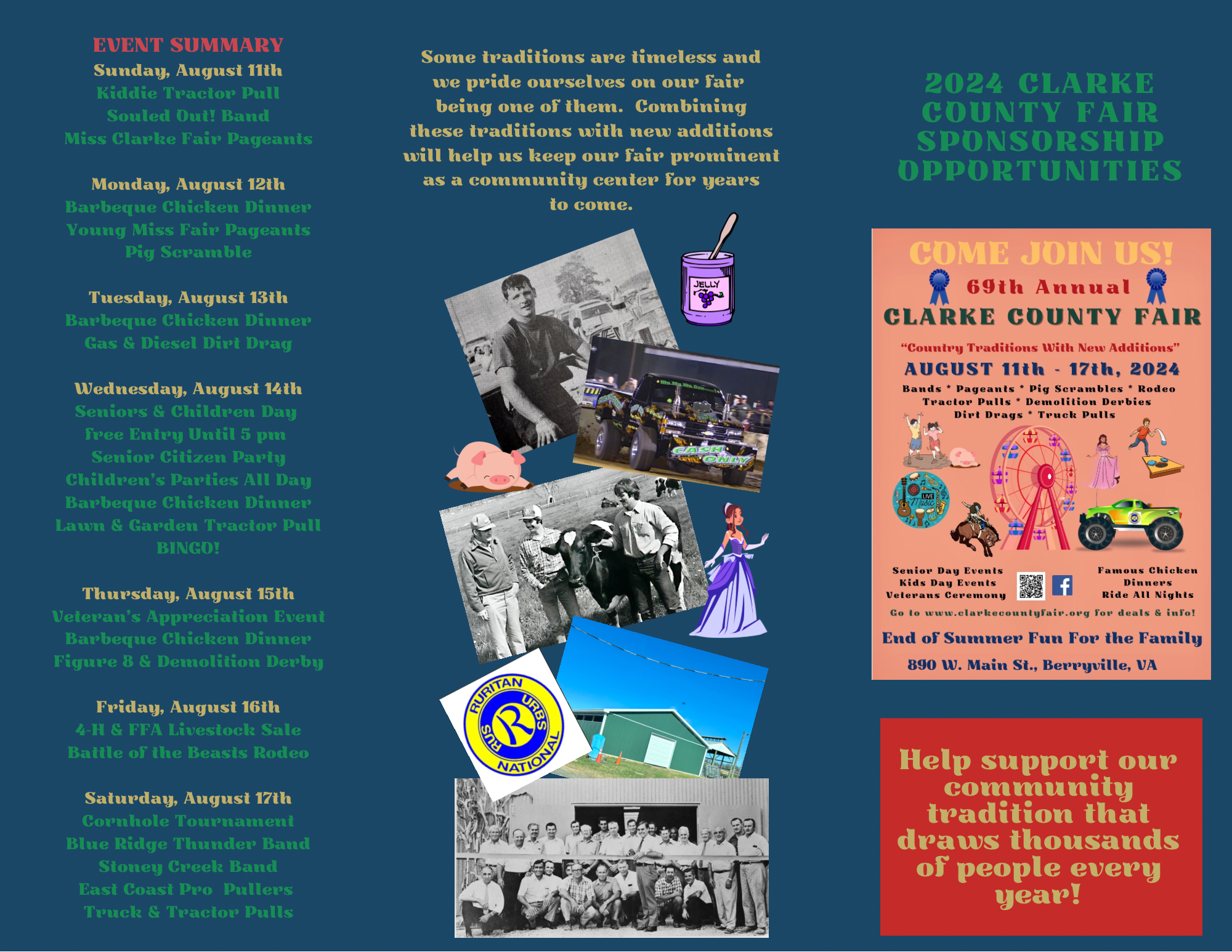 The Clarke County Ruritan Club is happy to be hosting the 70th Annual Clarke County Fair the week of August 10-16, 2025, at the Clarke County Ruritan Fairgrounds in Berryville. The much-anticipated fair is a huge community event in the Northern Virginia area with over 10,000 attendees each year. We are hoping you will consider helping to make this year’s fair a memorable event with a sponsorship contribution.
